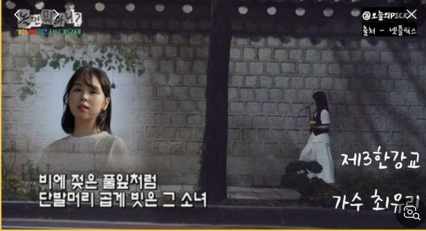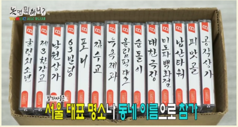 " 제3한강교", "낙원상가", "뉴욕제과", "종로서적" 등의 이름으로 누군지를 추측케 하면서 등장합니다. 친구와 연인을 만나던 "종로서적"이나 "뉴욕제과"의 이름을 듣고 옛 생각이 나신 분들이라면 이 방송에 무조건 빠져 드실거라 확신해요.